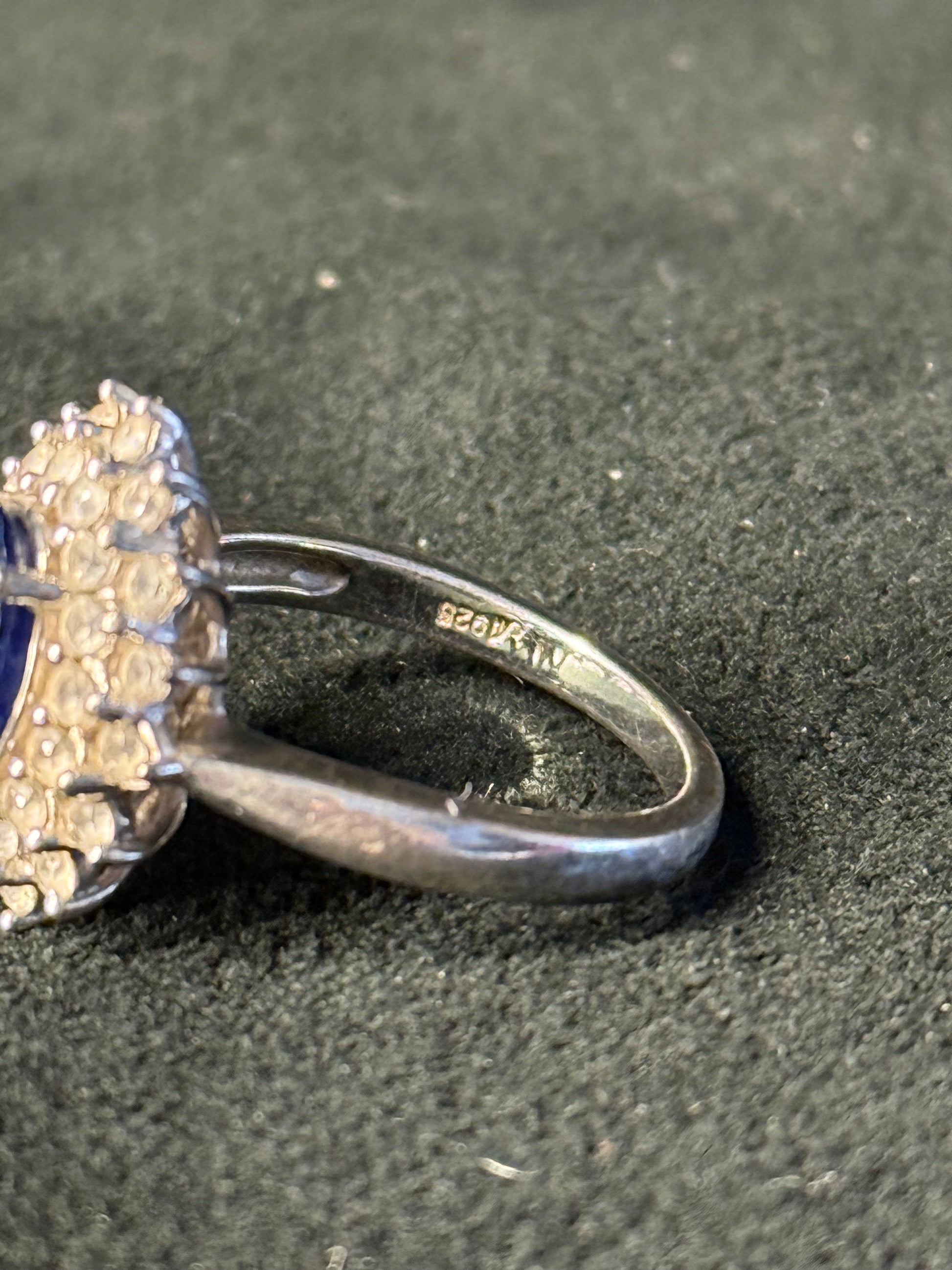 5.30 Carat Simulated Sapphire and 1.80 ct. t.w. CZ Ring in Sterling Silver.