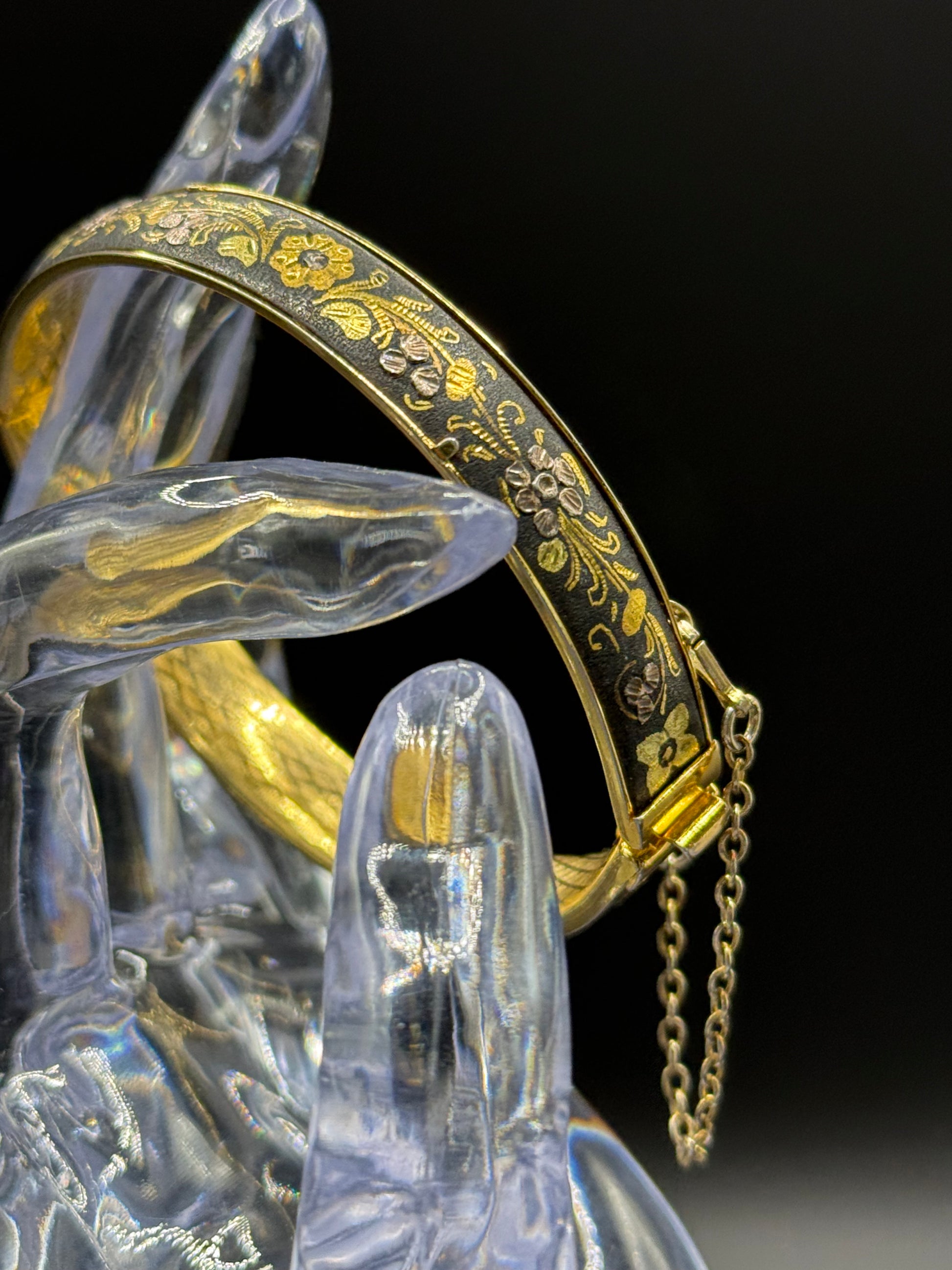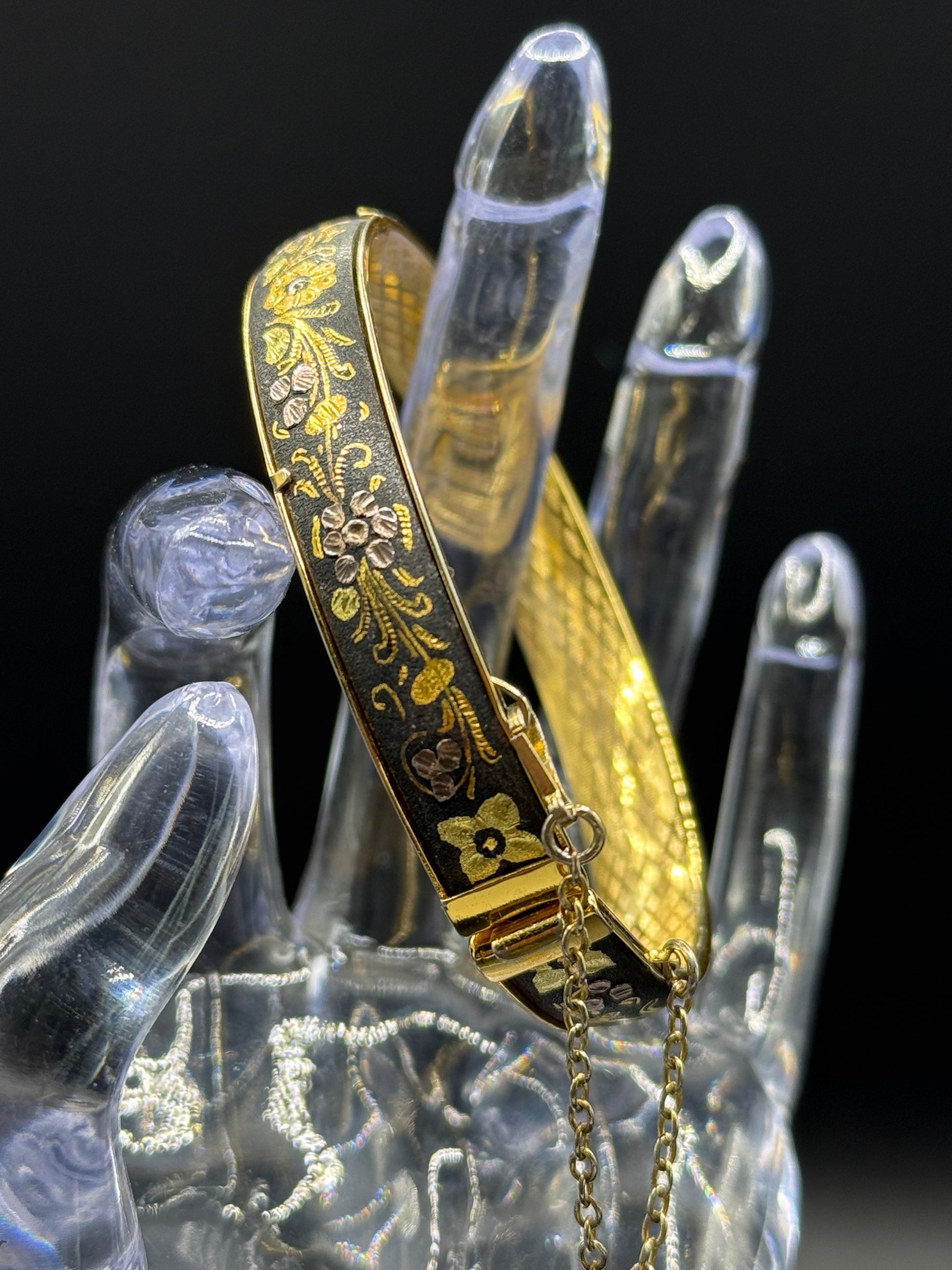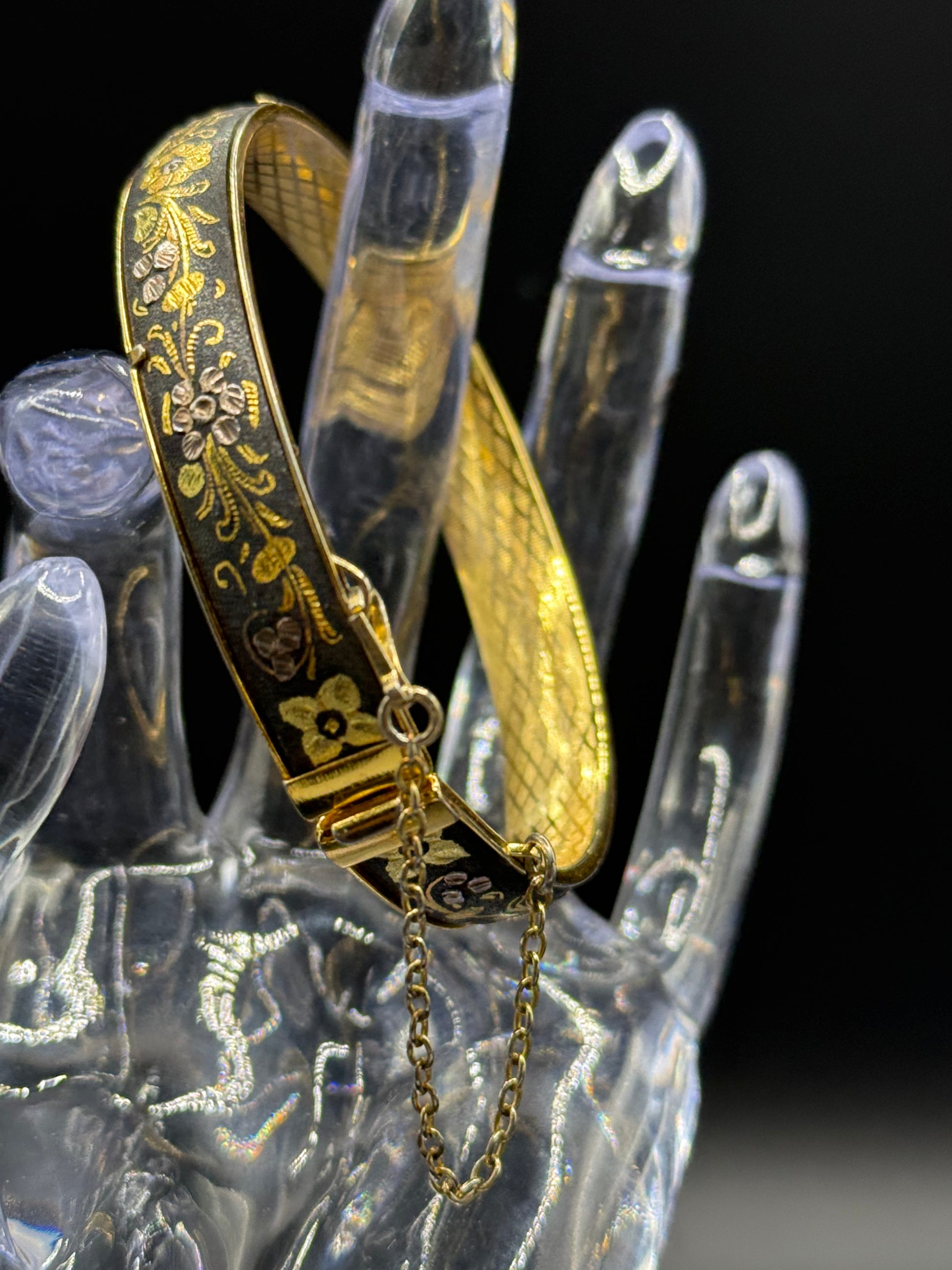 Vintage Gorgeous DAMASCENE Foliage Leaves Hinged Bracelet 2 3/8” Inside Diameter
